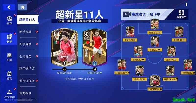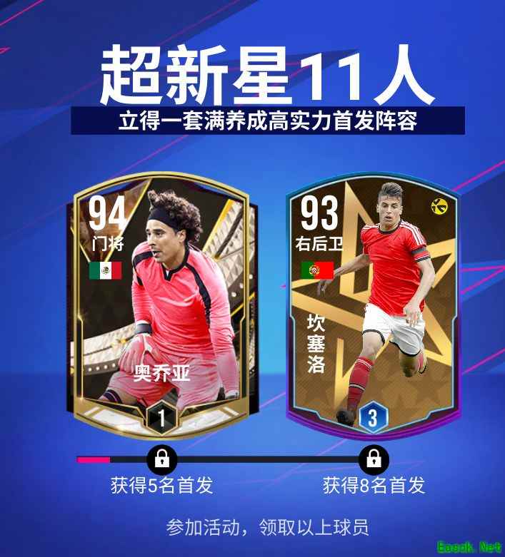 累计拥有5名首发球员,即可领取巅峰门将奥乔亚。