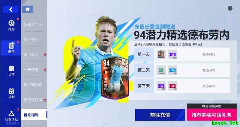 新玩家充值任意金额即可获赠德布劳内及系列道具。