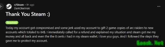 令人意外的是,Steam客服迅速响应,不仅成功为其追回全部损失,还连同账户中剩余的0.08美元余额一并返还。玩家在帖子中直言:“谢谢Steam,我爱你们。”