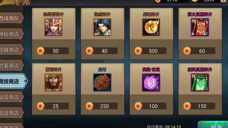 竞技商店每日刷新,可用积累的竞技币兑换随机出现的皇冠武将碎片,如周瑜、太史慈、徐庶,以及不定期出现的随机皇冠武将碎片宝箱。