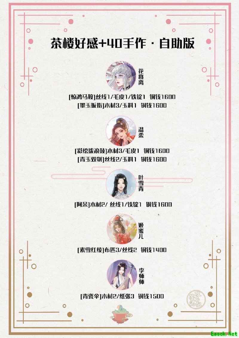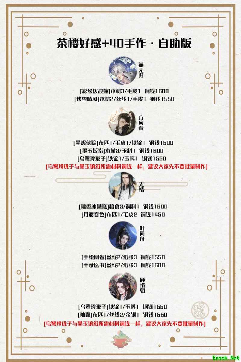欢迎来到遇见逆水寒茶楼手作攻略!这里有男女号通用的手作配方与送礼指南,持续更新,简易到详细版本全涵盖,缺啥问啥,轻松搞定好感礼物~