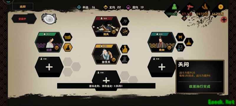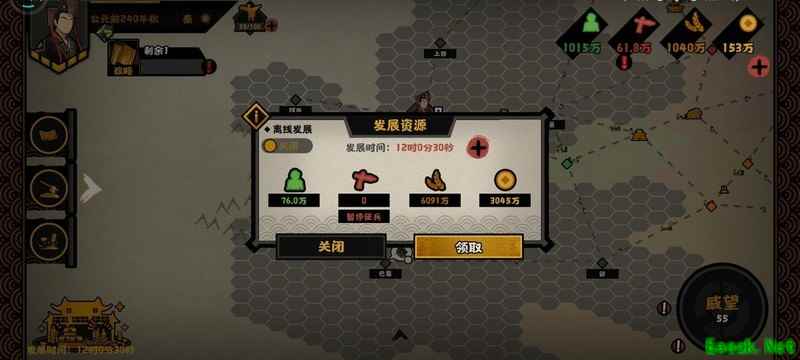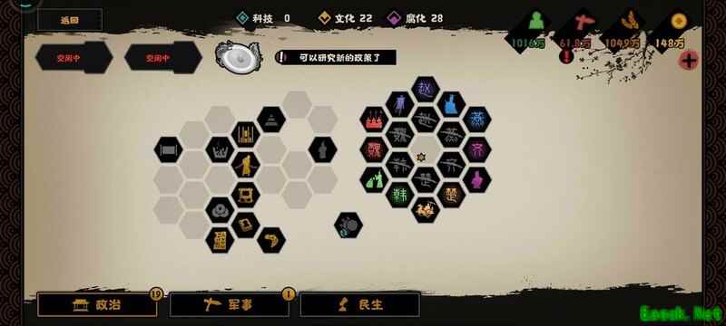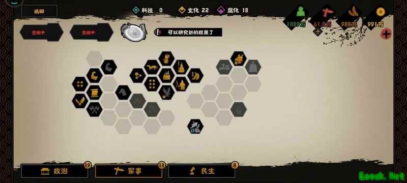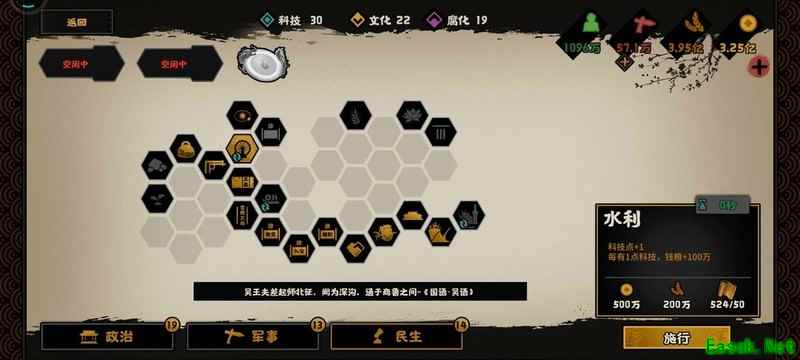 返回民生界面,优先解锁提升战力与资源产出的关键科技水利,将其等级升至约30级,其余政略点根据实际情况灵活分配。此时战力可达500左右,若名臣星级较高,甚至能突破600,配合各类能力卡,足以轻松横扫对手。