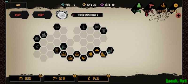 建造完成后可选择升级建筑,虽非必须,但因个人习惯我会全部升级。接着进入政策界面,依次选择民生与政治相关选项,若印玺不足,可用政略兑换补充。