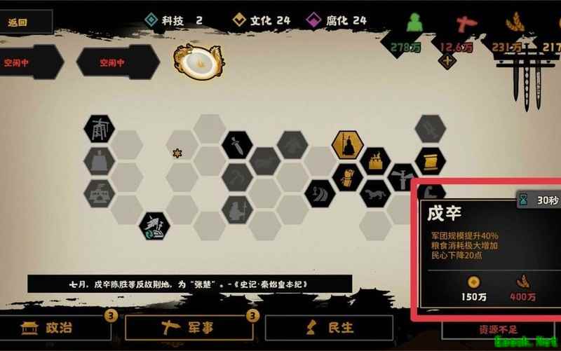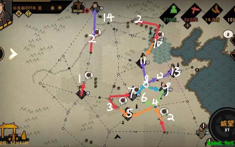 若想加快进程,可带上李斯(秦楚汉初始人口直接200万,帝王术助统一),但整体提速有限,因战斗较多且需逐一攻克。