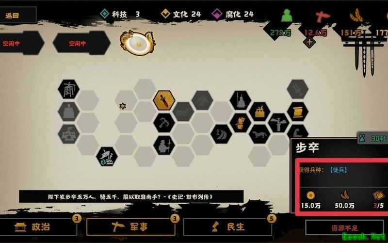 开局先出三士子,搭配妇好作战,经历数场战斗后迅速升级为戍卒,集齐三个青铜,在攻占城市后利用特殊资源直接招募二级兵。