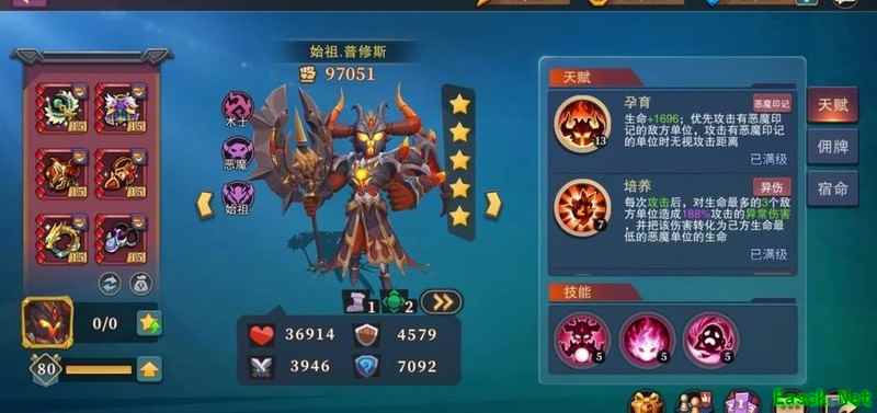 始祖·普修斯,常称始祖,是游戏中机制最强的存在,堪称魔魂队与虫术队的核心主力,单独使用表现同样出色,常见搭配如始祖天龙战、始祖游魂天。其具备输出、回血、解控、复活等全面能力,技能强势,升至稀有金五星并充分培养后,伤害将实现质的飞跃。