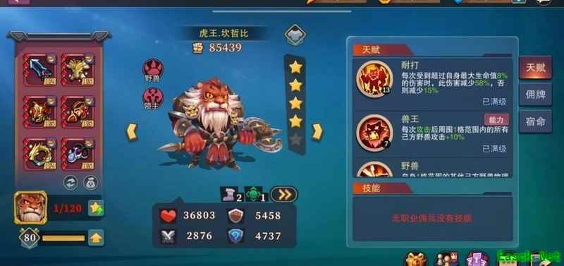 虎王坎哲比,号称兽王,常与国王并列为最耐打的佣兵。擅长搭配兽族、剑士及精灵阵容,与凤凰剑配合可实现强力回血。能为周围兽族提供群体增攻,助力凤凰成长。稀有金色五星极致肉盾,兼具实战与副本表现,深受高手青睐。