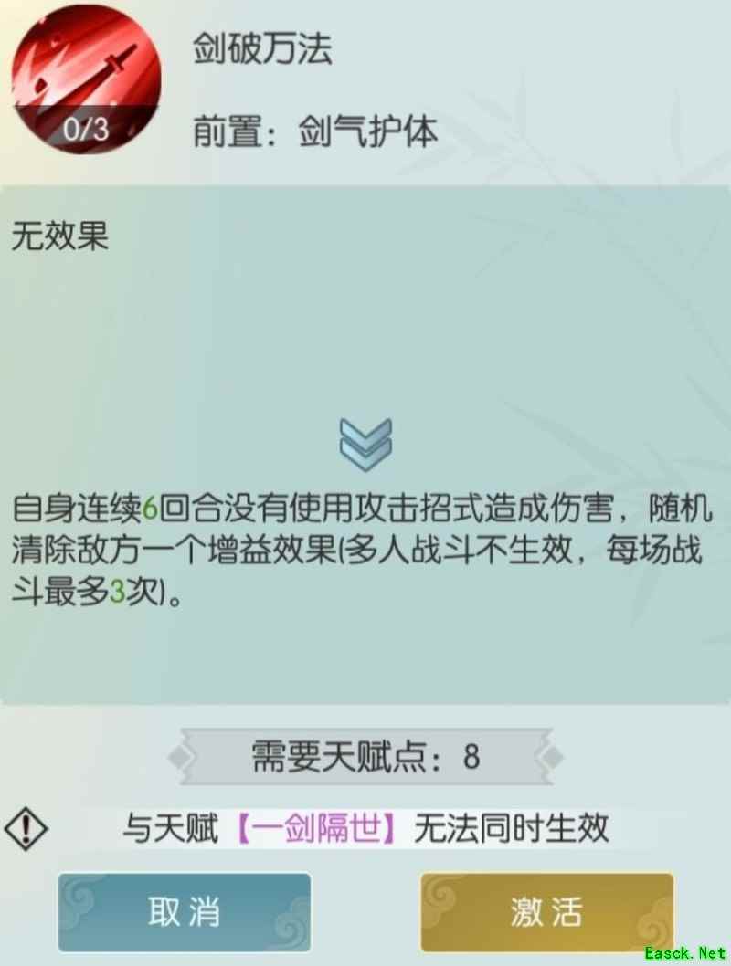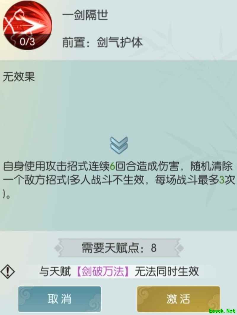第五天赋在一众剑右天赋中较为晦涩,主要体现在一剑隔世与剑破万法上。一剑隔世满级效果为:连续四回合使用主动攻击技能造成伤害后,随机永久移除一个招式。需注意,此处的攻击招式必须由人物主动释放,平砍、五斗米术或风林火山等持续四回合的灵兽技能均不计入。表面看此条件极为严苛,实用性偏低,多数情况下难有发挥。然而其隐藏机制极为特殊——被清除的招式是彻底从战斗中删除,属于永久性移除,不同于剑破万法的暂时封印,这一点常被忽视却意义重大。