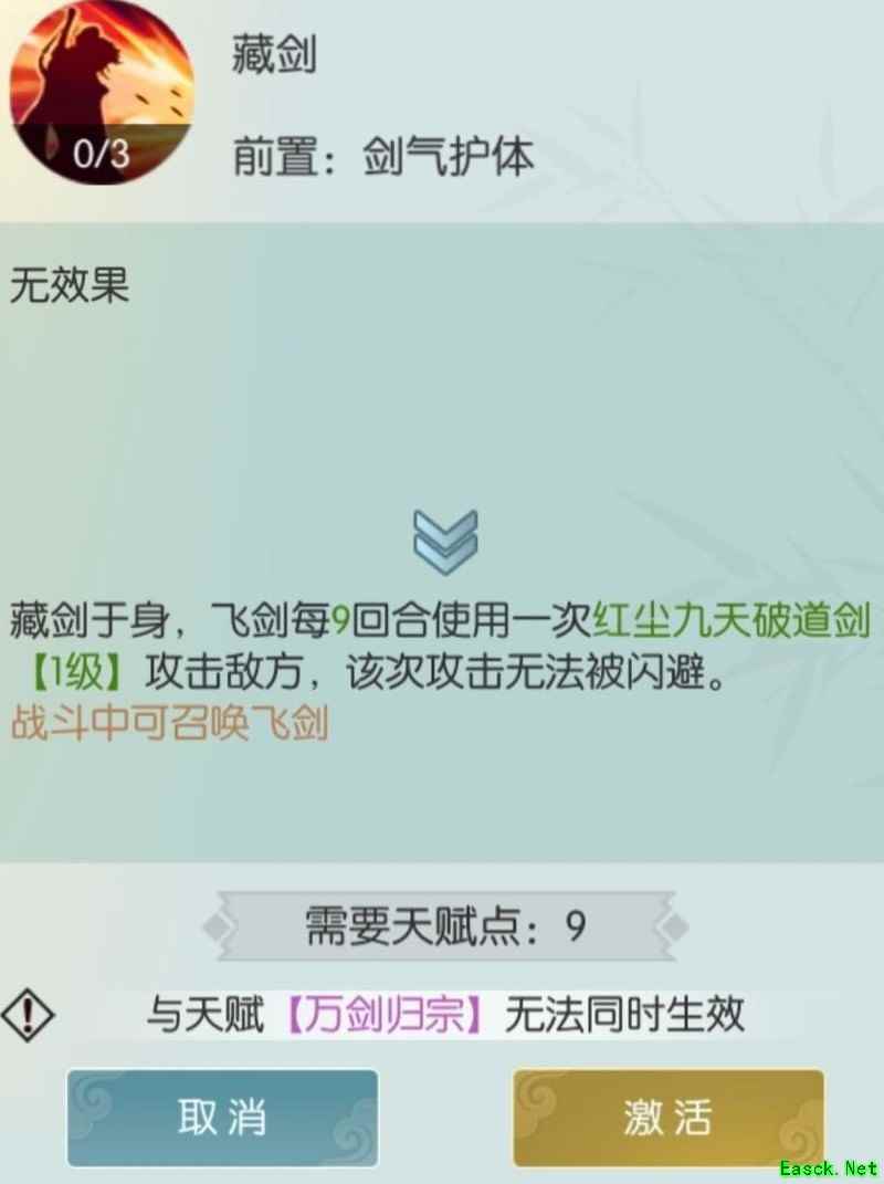第六天赋可选择藏剑或万剑归宗。藏剑每九回合触发一次红尘剑,必定命中且无法闪避,适合用于拥有五层或六层增益状态、普通攻击无法破防的情形,能稳定补充伤害。当敌人出手频率较低时,万剑归宗效果受限,此时藏剑更为实用。两者择一携带即可。战斗中若选择藏剑,角色剪影旁会多出一把剑作为提示。最新发现,藏剑的伤害仅与自身攻击力相关,不受己方增伤类神通或法则影响,也不受敌方减伤神通干扰,因此在对抗高减伤目标时表现尤为出色,是应对特定难关的有效手段。