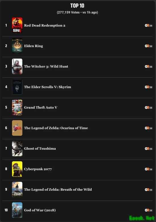 虽然投票仍在进行、排名可能继续变化,但《荒野大镖客:救赎2》目前的领先优势相当明显。