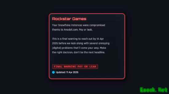 该组织要求4月14日前支付赎金,否则泄露文件。目前仅公司数据遭访问,无证据显示客户密码、支付信息被获取。该组织在暗网发文警告:“RockstarGames,你们的Snowflake实例被Anodot.com攻破,要么付钱要么泄露,4月14日前联系我们,否则将带来数字麻烦。”