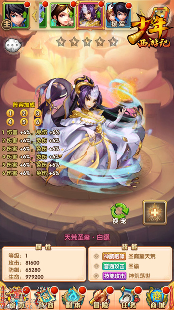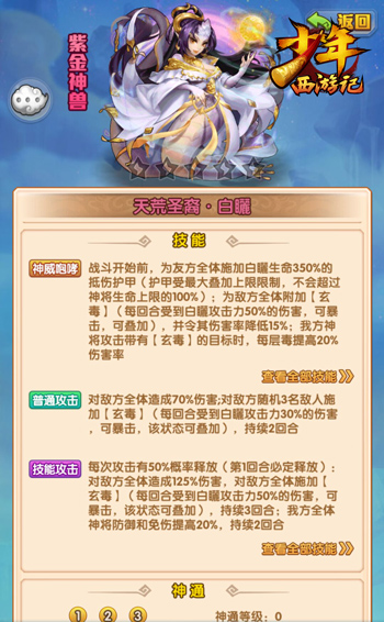 天荒圣裔·白矖不仅拥有强大的技能属性,它还拥有紫金神兽的两大特色养成系统——神兽化身和神兽法术。
