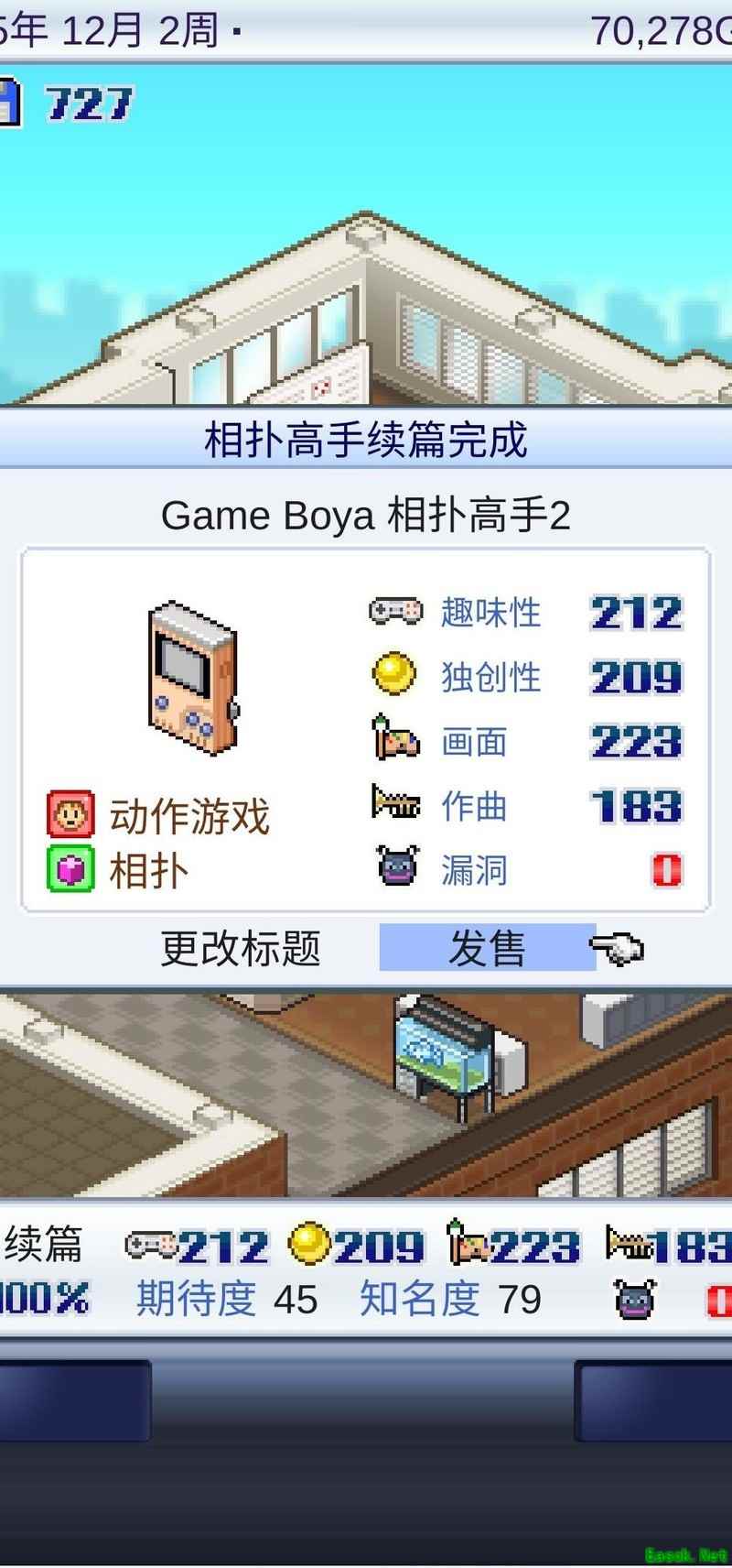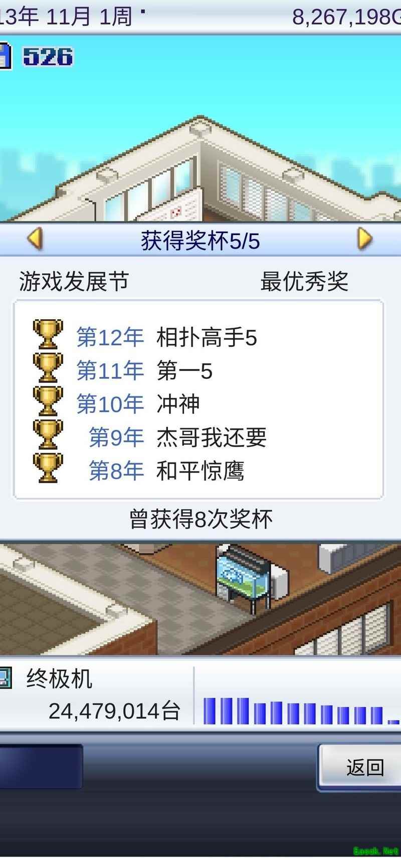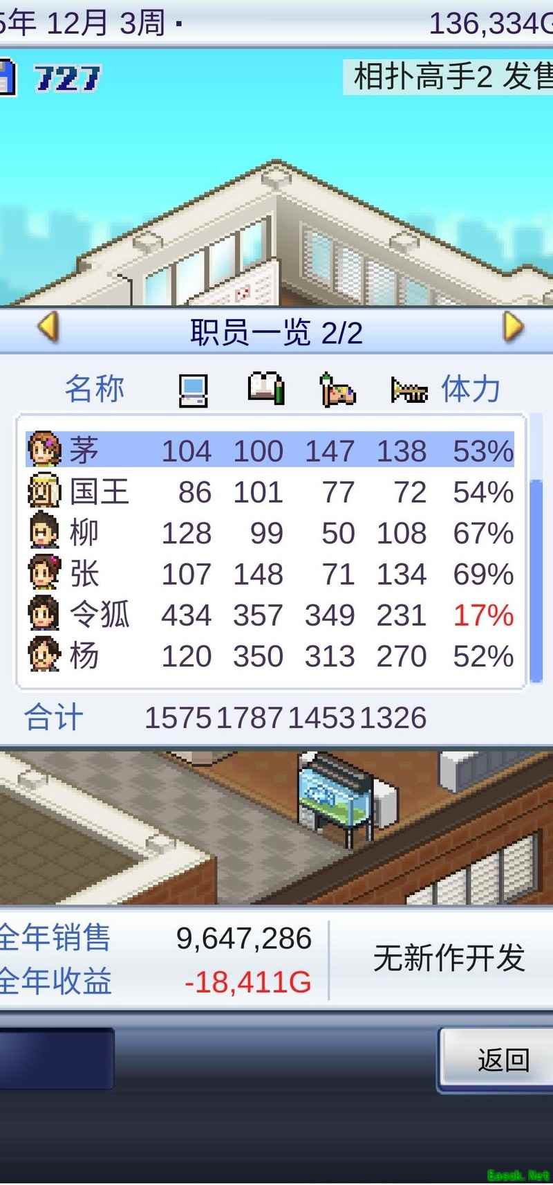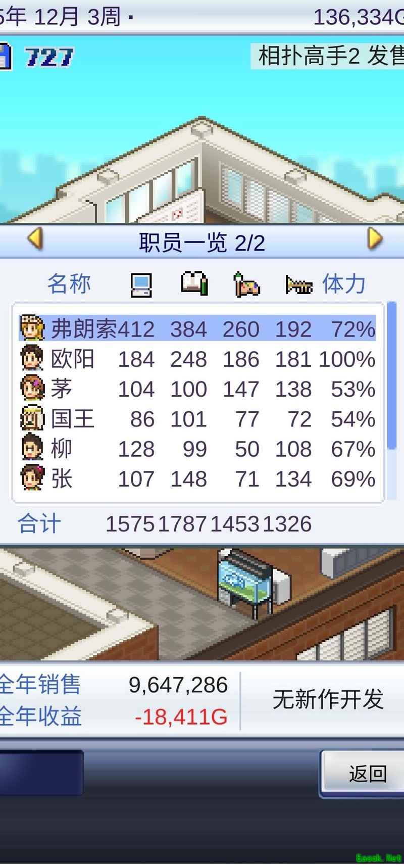通常情况下,只要作品尽早入围并实现畅销,基本都能获奖。到了第四年,便可搬入六人规模的工作室。此时优先招募柳春凯、程惠、石雄敏三人;若有国王角色则直接招募国王,否则选择X先生。实际上,使用倒数第二个招募选项也能成功招到上述人选。接着,将桃子和王璐美替换下来,由这四人组建核心开发团队。由于过渡期较短,无需长时间培养:程惠专注绘画能力提升,石雄敏主攻音乐,柳春凯只需简单培训即可。待三人能力成熟后,立即投入游戏开发,期间尽量确保作品入围——若未成功,可采用读档重来的方式调整。唯有入围且热卖才能积累足够资金,进而升级至八人工作室。此后所需素材可通过旧书店与相扑活动循环获取,这两项资源人气高、效率佳,便于持续运营。