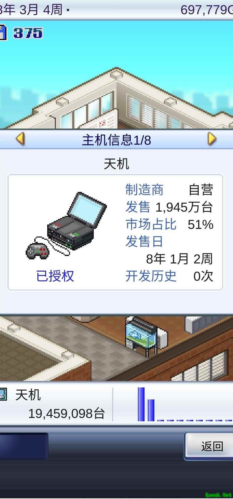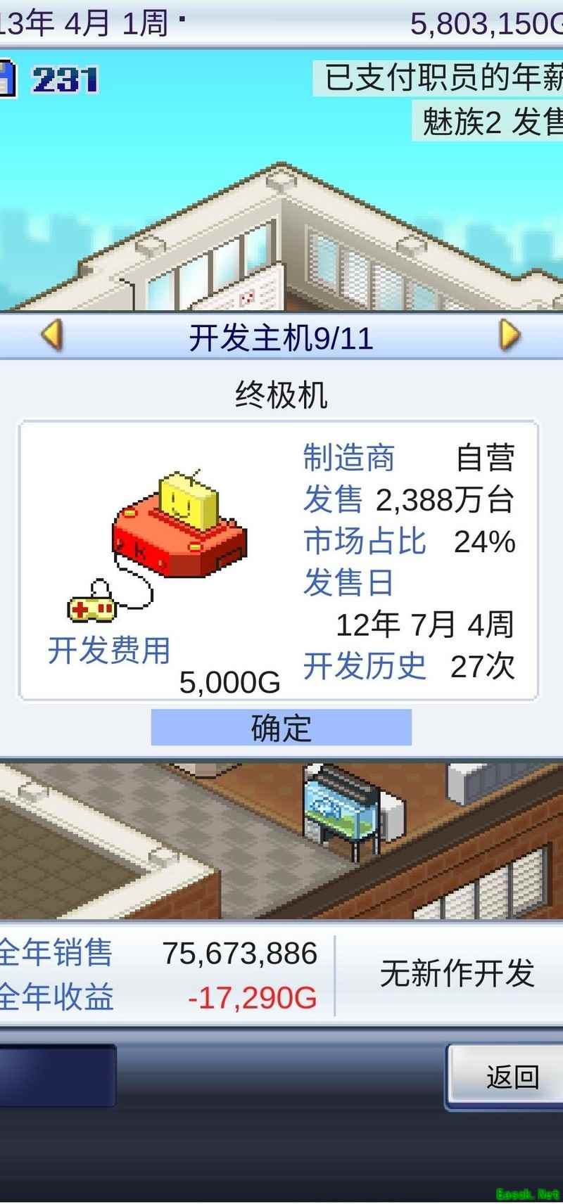 此后基本每款游戏都能成功入围并大卖,既能推出续作,也可尝试新题材来寻找灵感,核心目标始终是盈利。积累足够资金后,可优先为小花升级(若资金紧张则先提升国王),逐步转向硬件研发,待资金充裕便着手开发主机。我耗时七年完成主机研发,八月初正式推出。建议尽量打造顶配机型,即便非顶级配置,预计也能占据约40%的市场份额。我于第八年发布主机,当年即实现市场占有率过半,若第七年推出,表现或许更佳。