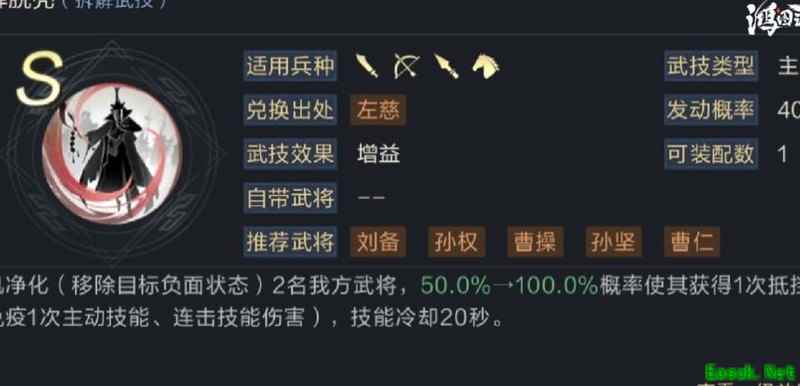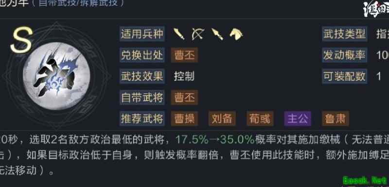 1号武技首选金蝉脱壳。由于曹丕自带技能特性,通常主加政治属性,导致智力偏低,难以充分发挥依赖智力的治疗类技能。而金蝉脱壳具备的格挡与净化能力,更契合其战斗定位,实战中表现更为稳定可靠。