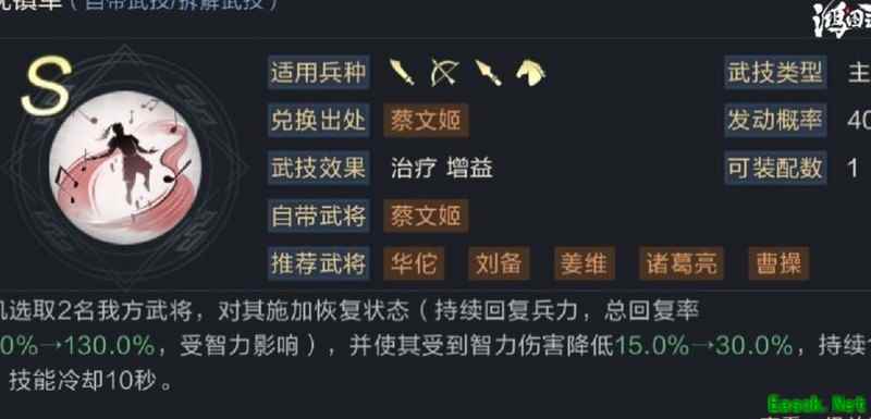 推荐1号武技选择宣抚镇军,可同时为两名我方武将提供持续治疗,并降低其所受的智力伤害。该技能冷却时间短、回复效率高,兼具智力减伤效果,十分适合作为主力治疗技能使用;若频繁对阵物理输出队伍,亦可替换为固本培元以增强生存能力。