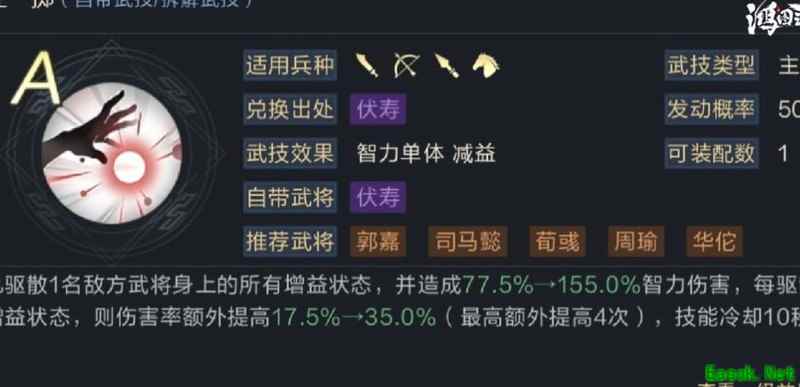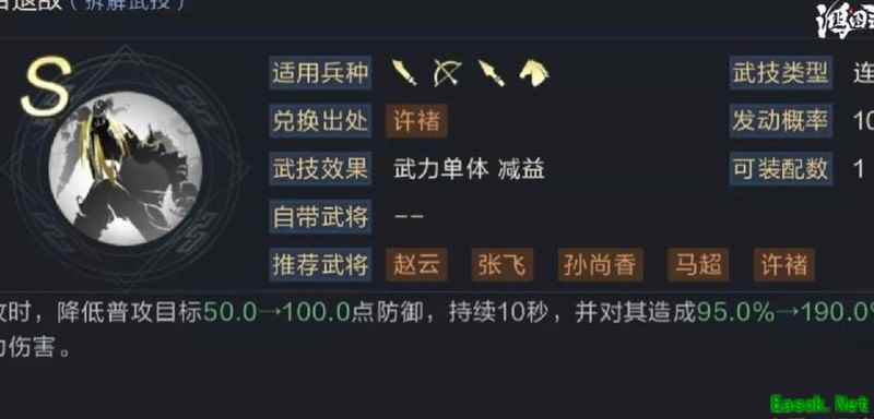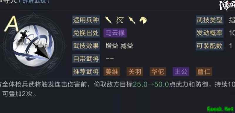 推荐2号武技选择先声夺人,使于禁在连击时偷取敌方武力与防御,结合怒目退敌的减防效果,可令目标防御大幅降低,显著提升输出能力,有效增强战斗压制力。