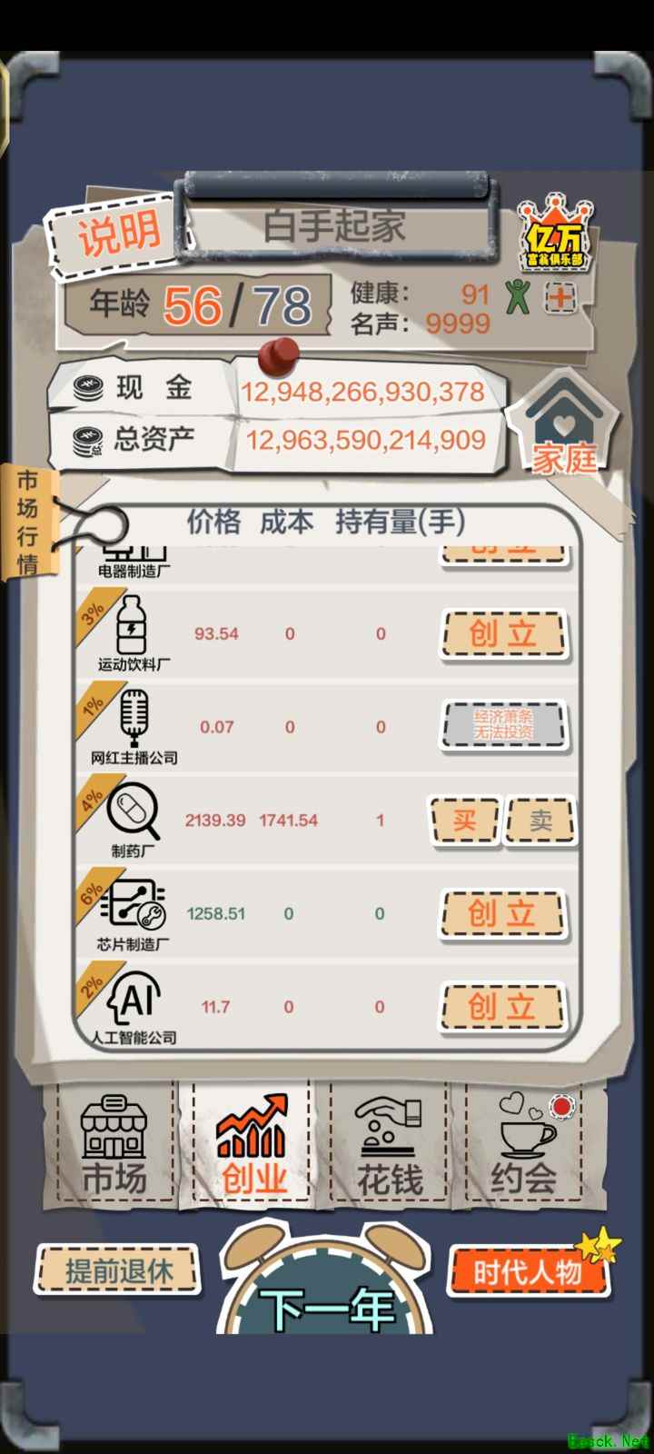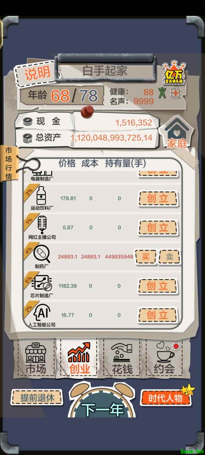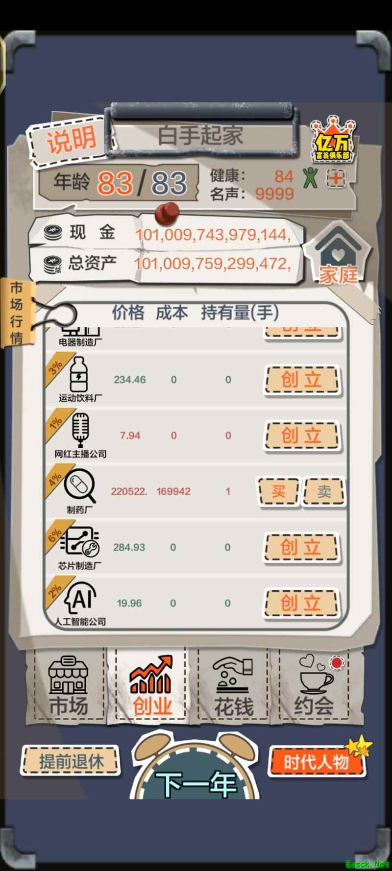 想要挑战极限,开局必须刷好,关键天赋要点满,如资本运作、老当益壮、经营理念等,彩票、桃花运、大富论坛、倒爷、销售达人也尽量点满,提升整体收益。