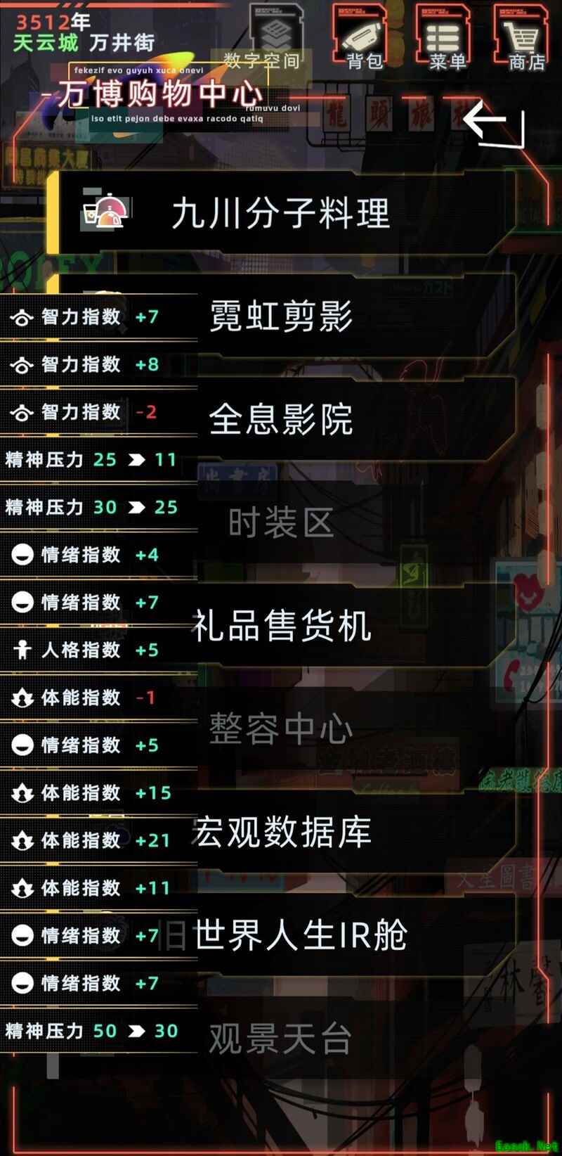 全息影院有多个项目可供选择:数字骇客可大幅提升智力与情绪,同时增加压力并开发脑域;我不是DJ则提升人格但降低情绪;午夜列车增加情绪并缓解20点压力;波西米亚癔症增强社交与智力;21世纪则提升人格并增加压力。此外,料理店提供超过30道菜品,首次食用必定大幅增加体能、情绪、智力、社交与人格,后续效果依据当前数值而定,数值越低效果越明显,通常可生效两到三次。