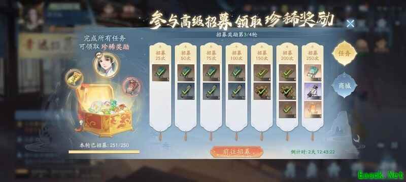幸运招募活动简称250抽,因每轮需消耗250张绿券才能领取全部奖励,建议大家提前保留绿券,等活动中再使用。本次活动包含四轮奖励,可兑换自选稀有侠客、红券和紫券等内容。普通玩家完成一轮即可抽取,不必强求四轮。此外,商城中可通过金龙购买绿券,共25张,总计需花费5000金龙。