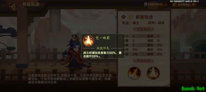 陆逊在场时,智力提升90%,暴击率增加20%。