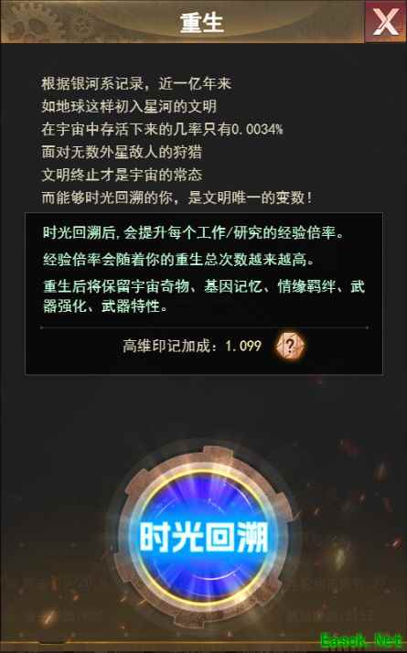 那么经验倍率究竟是如何计算出来的?根据游戏说明,我们可以得知每一项研究和工作的经验倍率都是通过特定方式得出的。其中起关键作用的因素有两个:一是该项研究或工作的历史最高等级,二是高维印记带来的加成效果。历史最高等级的提升相对直接,只要不断积累即可。而真正影响倍率增长的核心在于高维印记加成,这也是本文要重点讲解的内容。高维印记会随着每次轮回逐步提升,其增长依赖于三个不可逆的参数:击败敌人的总数、基因记忆的强度以及重生的次数。这些数值只会不断上升,不会减少。因此,只要持续游戏,高维印记就会稳步增长,随之带动经验倍率不断提升。经验倍率越来越高,也就意味着将研究技能升至满级的目标将越来越接近实现。