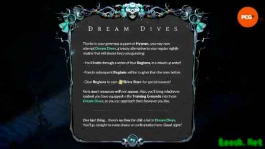 在“梦境深潜”模式下,玩家将使用训练场中当前装备的配置,与普通模式相同。完成区域后,玩家将获得新货币,可用于兑换特殊奖励。不过,大多数其他资源不会掉落,而且“没有闲聊时间”:选择增益效果和守卫战前的对话将被跳过,直接进入战斗。