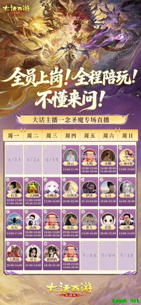 明日起至5月7日,大明、伊泽、西门、熙宝、夏天、沐云等数十位人气主播全员上岗!每天不同时段轮番直播新资料片内容,魔王窟通关技巧、新佩饰搭配思路、双套装洗炼秘籍,一站式解锁。少侠们可锁定心仪主播直播间,实时互动陪玩!
