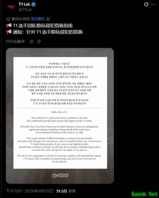近日,韩国电竞俱乐部T1发布声明,强烈警告针对其选手的网络骚扰和隐私侵犯行为,并表示若情况持续,将采取“正式法律行动”。俱乐部同时呼吁粉丝共同营造“健康、尊重的粉丝文化”。