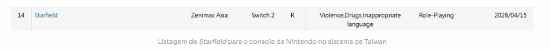 《星空》在登陆PC和Xbox Series X|S近三年后,刚于近期登陆PS5。据IGN报道,中国台湾评级网站本周泄露了《星空》Switch 2版本的评级信息,暗示这款太空RPG将登陆任天堂平台。