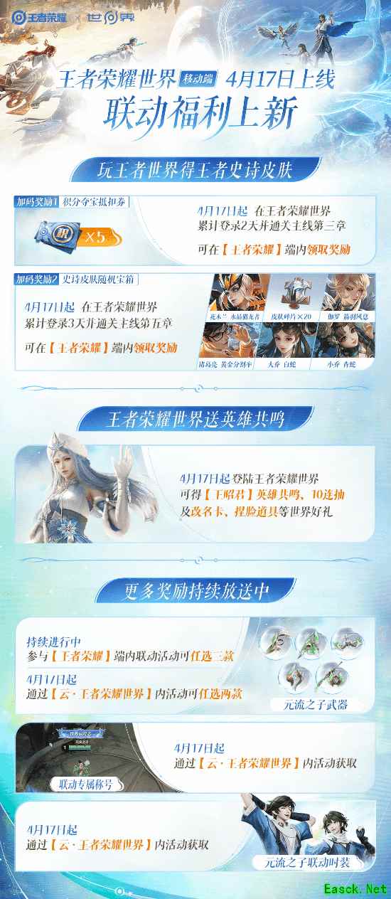 伴随移动端正式上线,官方还为全体王者玩家推出了全新的福利活动。自4月17日起,玩家登录《王者荣耀世界》即可领取包括「王昭君」英雄共鸣与10连抽在内的多种奖励。在《王者荣耀世界》游历并体验主线故事,更有《王者荣耀》史诗皮肤、积分夺宝券等奖励能够免费领取。也可通过【云·王者荣耀世界】登录,获取元流之子联动时装、元流之子武器以及联动专属称号。