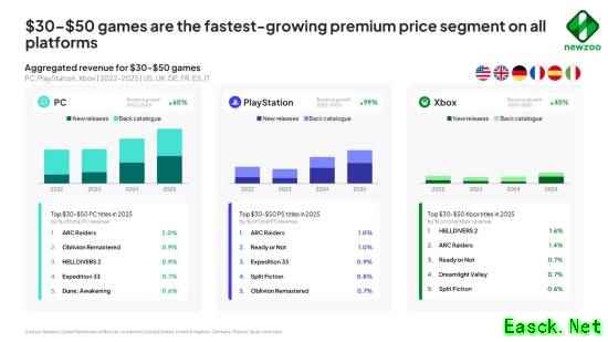 根据 Newzoo 发布的《2026年PC与主机游戏报告》,在 PC、PlayStation 和 Xbox 三大平台上,30-50美元档位的游戏贡献了近期收入的很大一部分,成为增长最快的细分市场。
