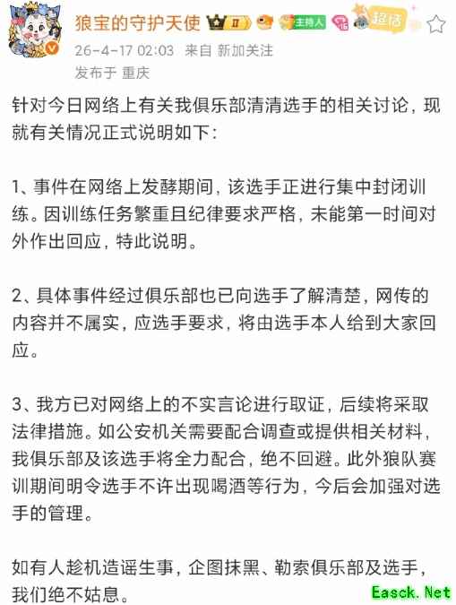 在清清发文后,重庆狼队官方运营也发布声明回应。