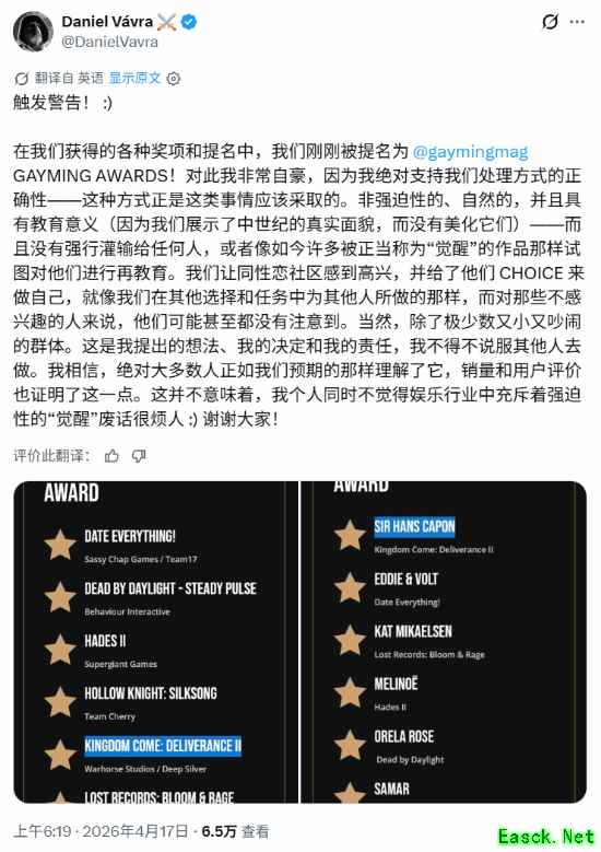 昨日,Daniel Vávra 在社交平台 X 上发布了一篇带有反讽意味“预警(TRIGGER WARNING!)”的长文。他表示自己对游戏获得 Gayming Awards 提名感到非常自豪,并坚持认为《天国2》处理性少数内容的方式才是业界标杆,因为它做到了“非强制性、自然且具有教育意义”。