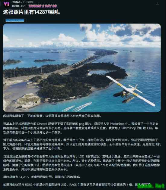 经过计算,这张截图中约包含14,287棵树(误差约数百棵)。虽然这一行为看似“无用功”,但也得出一个有趣结论:与《荒野大镖客2》单一区域相比,《GTA6》所使用的RAGE引擎在植被密度上至少提升了4倍。考虑到前作已经具备极高画面水准,这样的提升依旧令人惊叹。