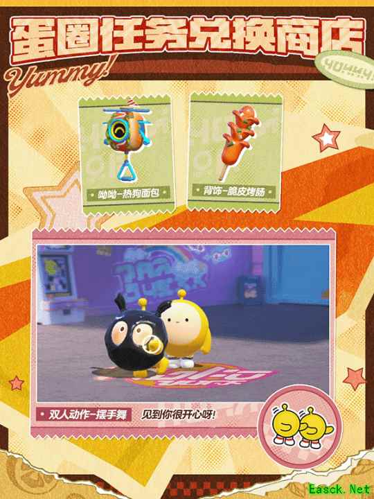 “元气零食季”派对季盛大开启,蛋仔们可通过蛋圈页面进入蛋圈任务,和蛋圈成员一起组队完成任务,即可兑换呦呦“热狗面包”、配饰“脆皮烤肠”和双人动作“摆手舞”!