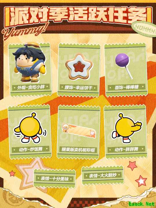 “元气零食季”派对季活跃活动正式开放!完成全新派对季活跃任务,即可前往兑换商店获取稀有盲盒“贪吃小胖”、稀有配饰“幸运饼干”、“棒棒糖”,更有派对季限定全新表情“十分美味”、“大火翻炒”,动作“炒饭舞”、“胖胖舞”,和“糖果贩卖机昵称框”等奖励等待兑换。