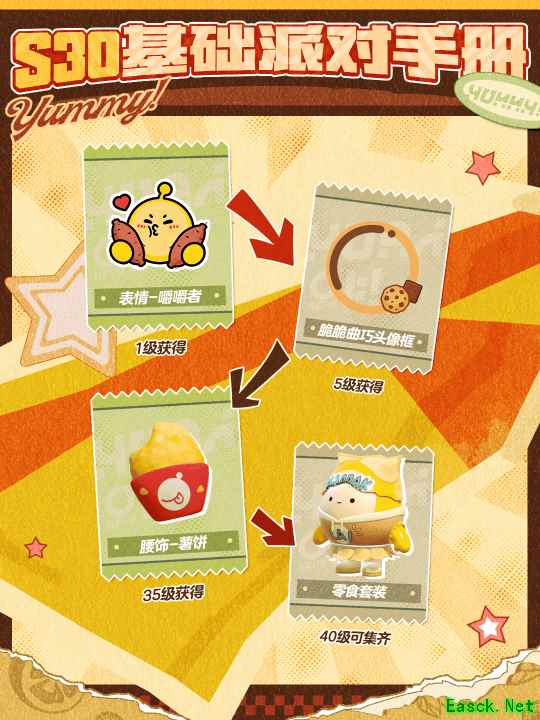 “元气零食季”派对季的派对手册分为基础版和高级版两部分,相应的奖励各不相同。本季基础派对手册的全部奖励有:800潮流纤维、17500瓶盖、稀有表情“嚼嚼者”、“脆脆曲巧头像框”、稀有配饰“薯饼”、高级装扮“零食套装”。