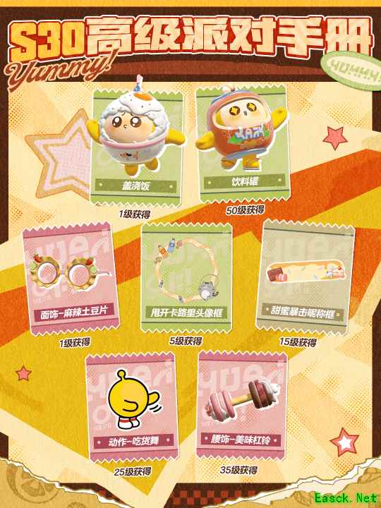 “元气零食季”派对季开启后,游戏将根据蛋位继承规则对玩家蛋位进行降级继承。与此同时,新派对季的开启也带来了新的蛋位任务,完成指定任务,即可领取外观“小洋葱”、 “美式咔叽套装”,配饰“咸鱼罐头”,及“四月心事头像框”等丰厚奖励!铁蛋五项奖励同步开启,可获得“初夏百合头像框”。