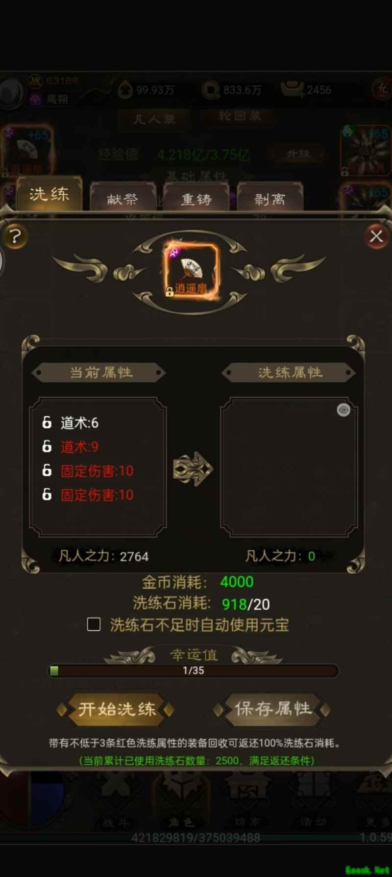 将幸运值点满35次后,锁定红色属性再进行洗练,必定出现一条红属性,重复操作即可稳定获得 desired 属性,真正依靠技巧而非运气。