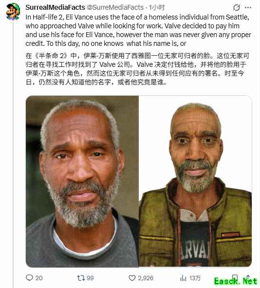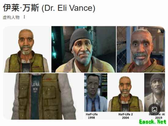 据称,在《半条命2》中,剧情中的重要角色伊莱·万斯使用了一位来自西雅图的流浪汉的面部建模,这个流浪汉当时在寻找工作时找上了Valve。