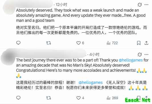 今天,英国学院游戏奖(BAFTA)将“Evolving Game”(直译为不断发展游戏奖,可理解为“爱的付出奖”)颁给了《无人深空》,官方发推文表达了祝贺和感叹。