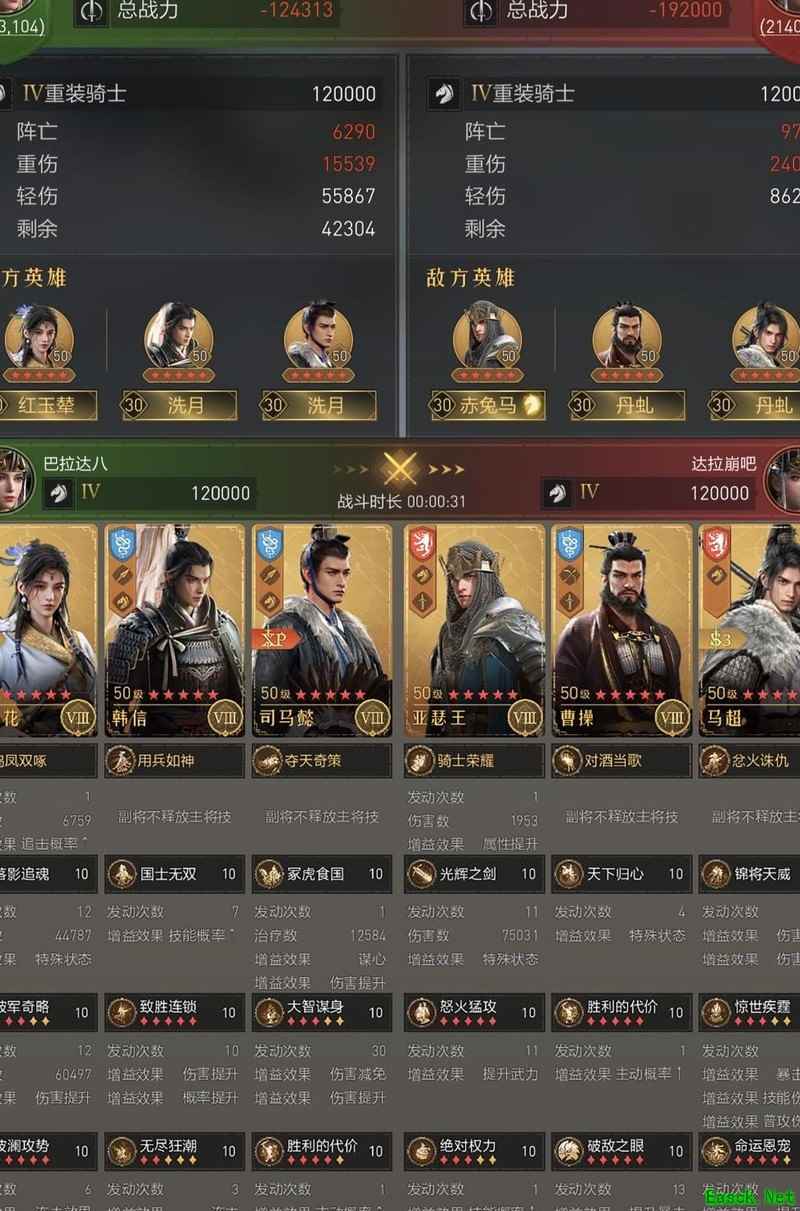 战报分析:波澜攻势与无尽狂潮双重叠加,极大提升了樊梨花的输出节奏。即便连击效果重叠,无尽狂潮触发后的伤害加成依然可观。曾稳居骑兵巅峰的暴击亚瑟骑,在樊梨花法术骑兵恐怖爆发面前,仅支撑31秒便告落败。