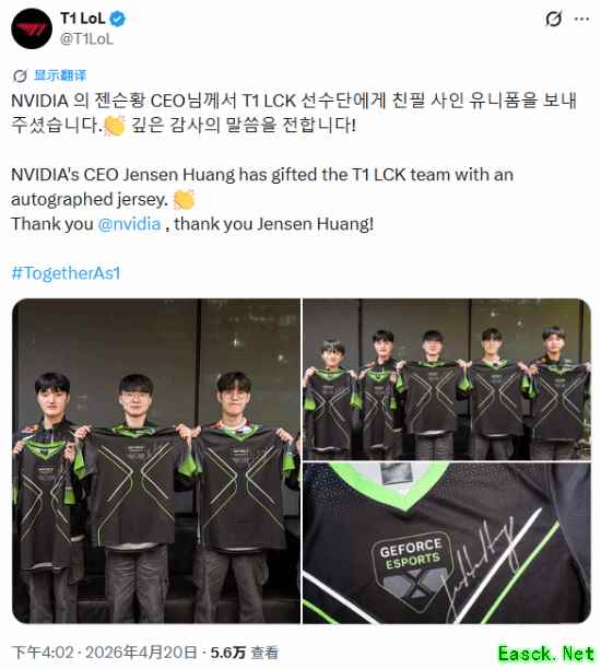 今日,《英雄联盟》LCK赛区T1官方晒照,感谢英伟达CEO黄仁勋向全队赠送的签名队服。