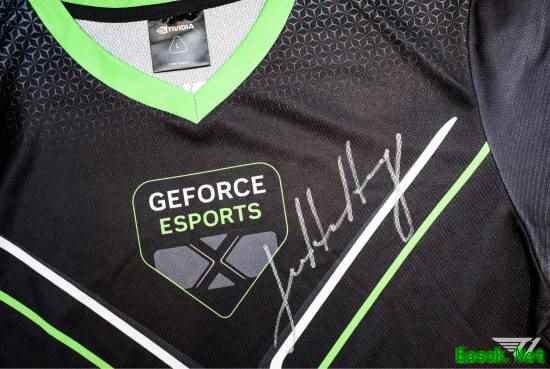 可以看到队服是英伟达经典黑绿配色,标识也是显卡的造型。Faker好像又压不住嘴角想笑了。