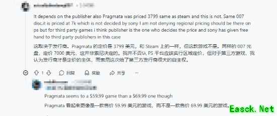 也有玩家提出不同意见,PS第三方游戏定价由发行商决定,本次争议游戏发行方Take-Two旗下公司本身就以高定价闻名。同时《识质存在》双平台售价一致,《007:初露锋芒》等游戏高价均为发行商决定,索尼并未直接干预。