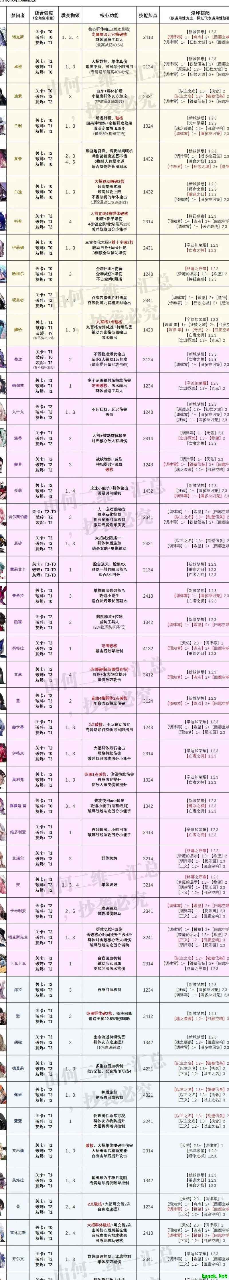 在10月4日发布全角色强度评级、核心功能、质变枷锁与烙印搭配汇总后,许多玩家通过私信建议增加各角色技能加点推荐顺序。由于该需求较为普遍,为方便大家查阅与收藏,现已将每位角色的技能加点优先级整合至更新版汇总表中,内容全面优化,结构更清晰,便于参考使用。具体样式如下所示: