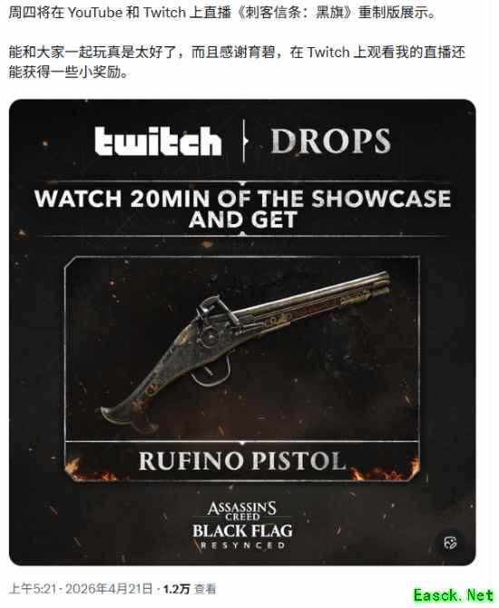 根据玩家社区的爆料,育碧将在《刺客信条4:黑旗 记忆重置》全球揭幕展示会期间同步开启Twitch掉宝活动。玩家只需在指定时间内观看指定直播满20分钟,即可领取这把名为“鲁菲诺”的手枪。这是育碧首次为单人游戏在发售前几个月设置掉宝奖励,被不少玩家调侃为“游戏未动,DLC先行”。