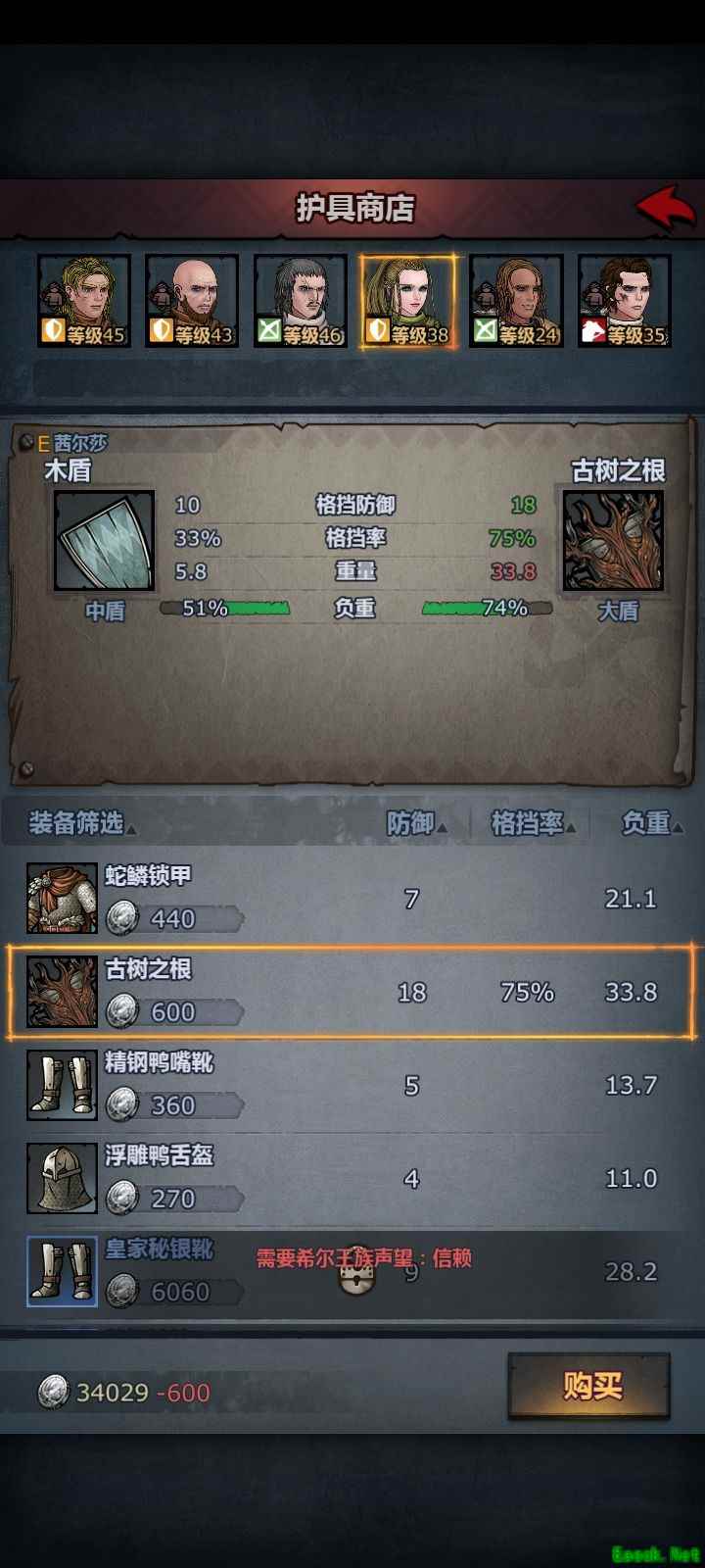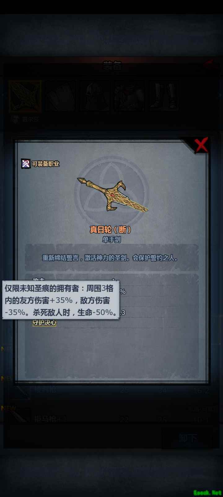 装备选择圣盾堡链甲三件套与大盾古树之根,四件白装均强化至+1,最后搭配真日轮—断使用。