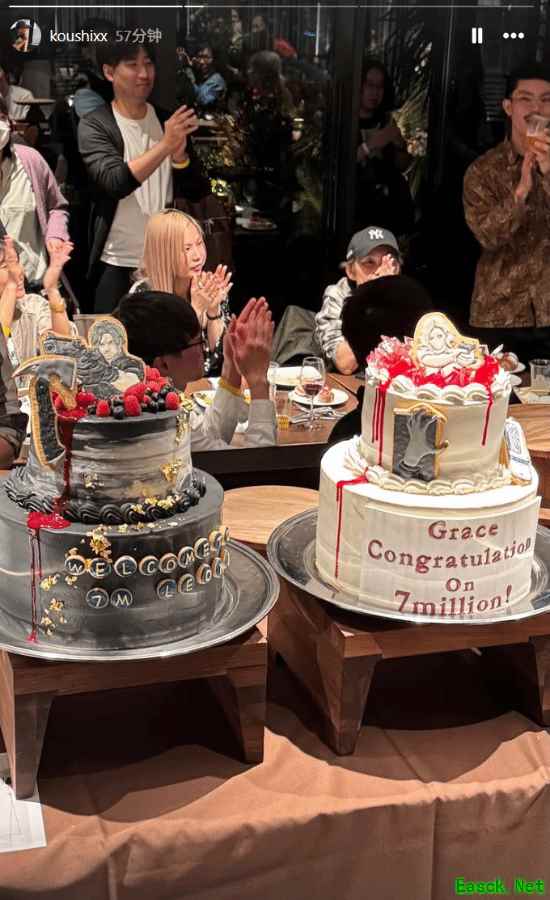 蛋糕上的贺词简单而有力,分别写着:“Grace Congratulatio On 7million!”(祝贺格蕾丝达成700万)以及“Welcome to 7m Leon!”(欢迎里昂迈入700万大门)。